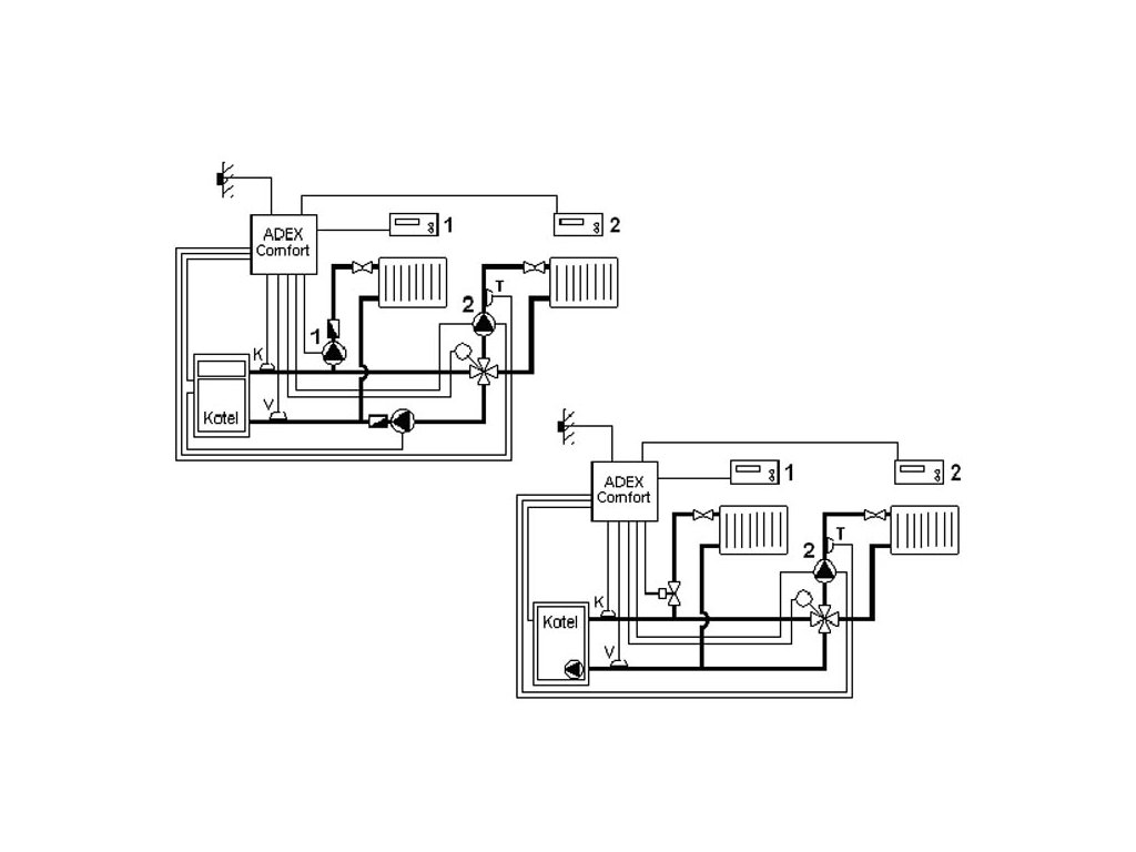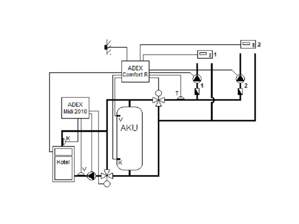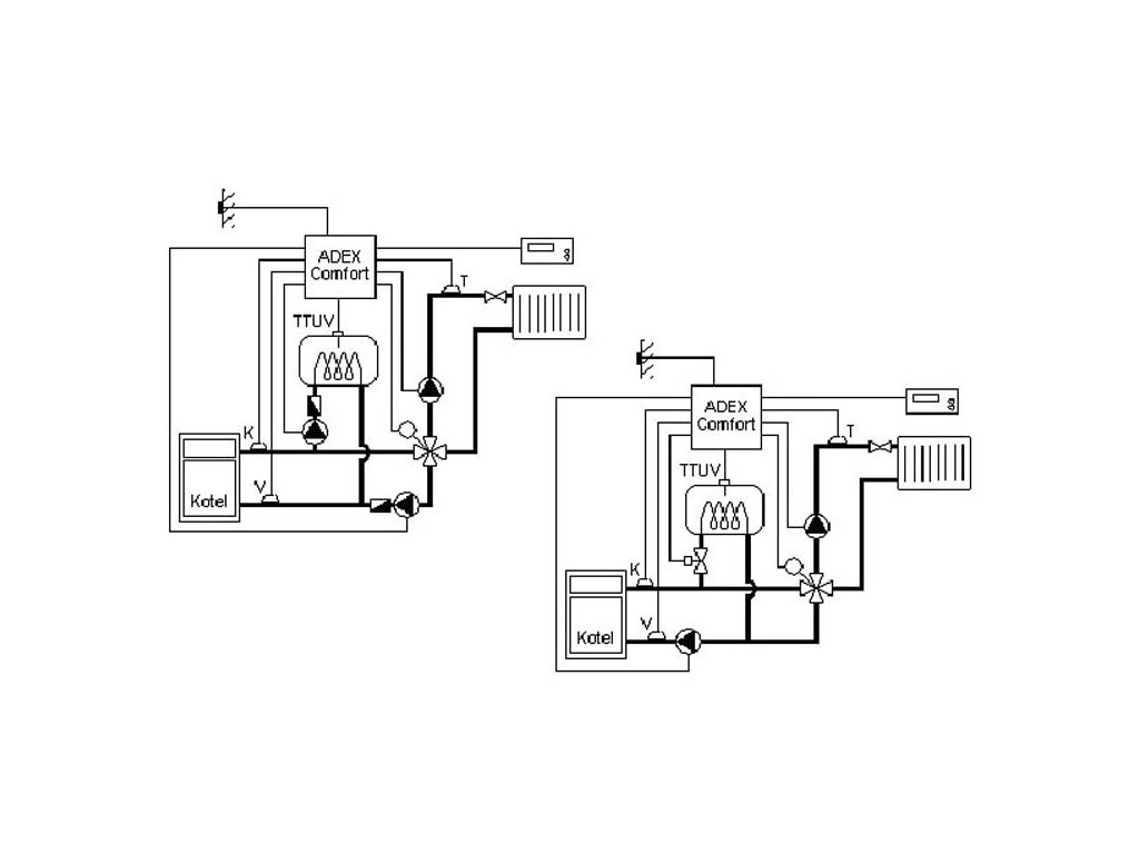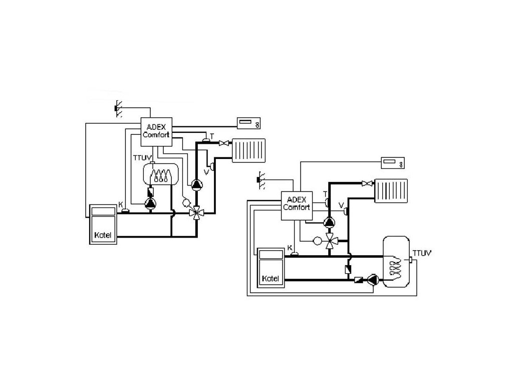 Regulátor ADEX Comfort R lze použít pro řízení jednoho z dvanácti topných systémů s topným okruhem regulovaným směšovacím ventilem. Nejčastěji se používá se čtyřcestným ventilem pro kotle s ochranou teploty zpátečky v Systému 1 nebo s akumulační nádrží v Systému 7.