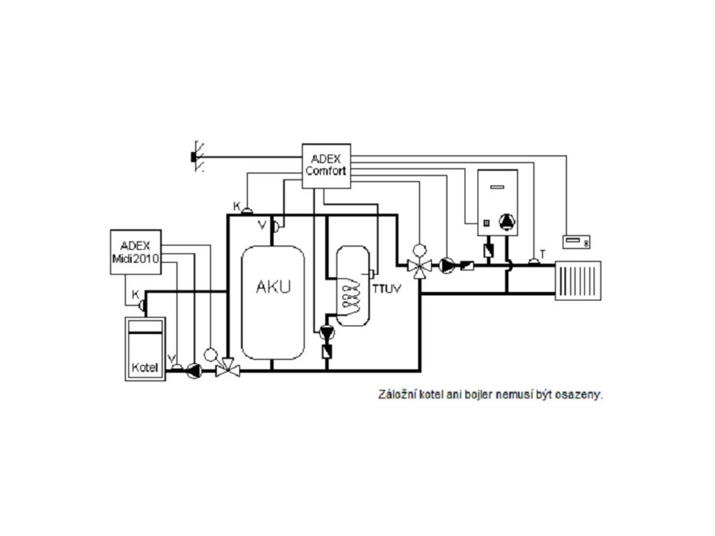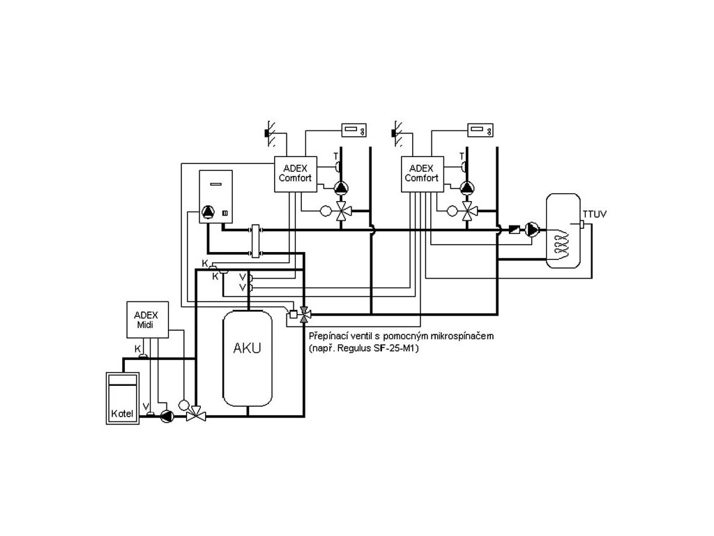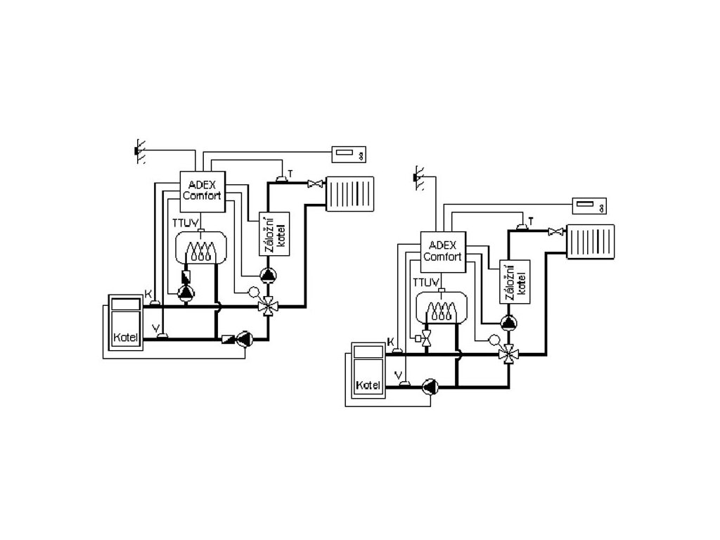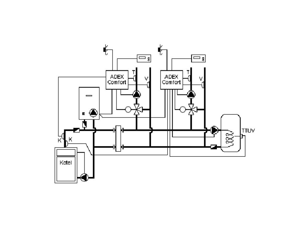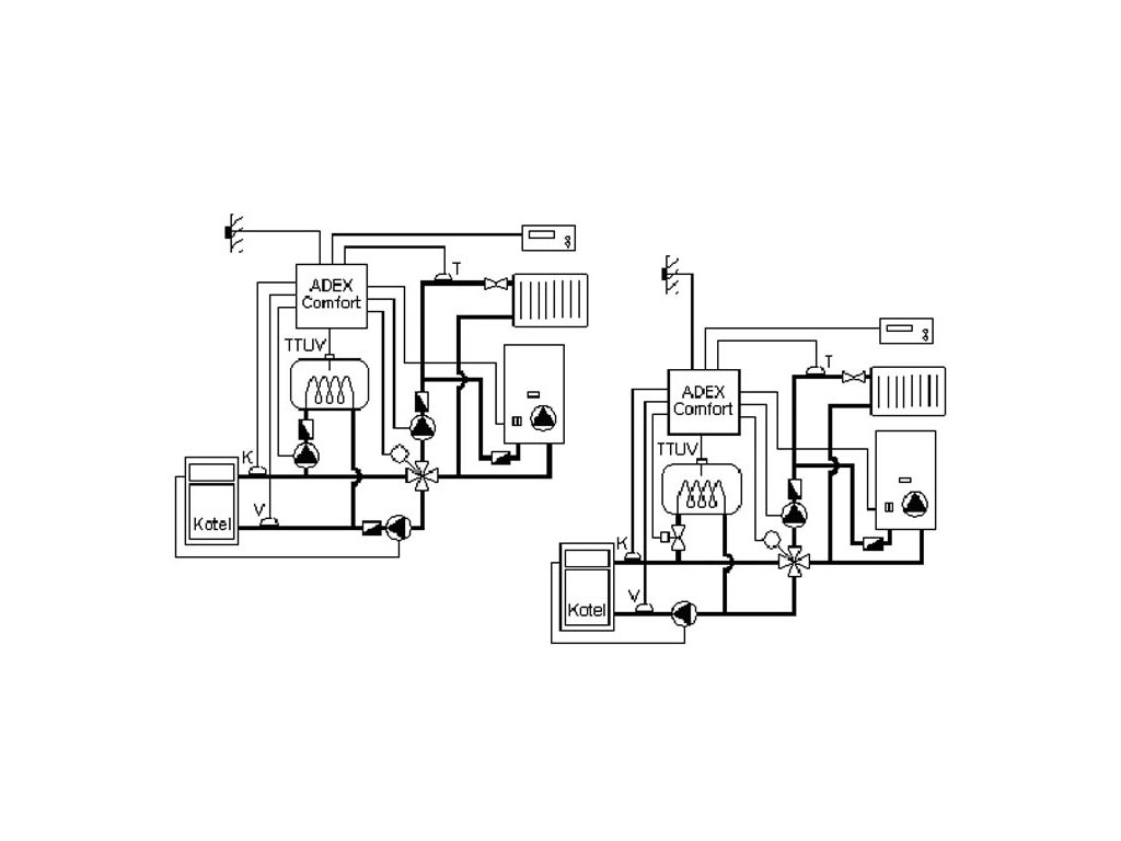 Regulátor ADEX Comfort R lze použít pro řízení jednoho z dvanácti topných systémů s topným okruhem regulovaným směšovacím ventilem. Nejčastěji se používá se čtyřcestným ventilem pro kotle s ochranou teploty zpátečky v Systému 1 nebo s akumulační nádrží v Systému 7.