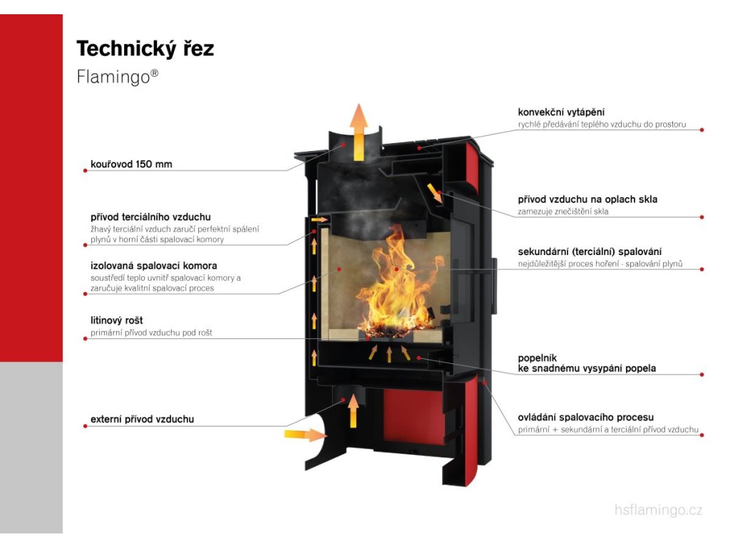 U kamen řady Flamingo je systém spalování na nejvyšší úrovni a zajišťuje centrální přísun vzduchu z exteriéru, který zajišťuje bezpečnost před výbuchem plynných částí pomocí plynulého přisávání čerstvého vzduchu. Inovativní prvek zajišťuje vysokou účinnost, snížení spotřeby paliva až o 40 % a zejména šetrnost k životnímu prostředí. Množství popela je minimální. Celý spalovací proces je ovládán dvěma táhly, kdy první slouží k regulaci primárního vzduchu, který je zapotřebí k zatopení a rozhoření dřeva. Druhé táhlo slouží k podpoře sekundárního spalování. Jeho otevřením dochází k přísunu předehřátého vzduchu do horní části spalovací komory. Tento vzduch se používá k úspornému a co nejefektivnějšímu průběhu hoření dřeva. Tímto je zajištěna vysoká účinnost a krásné hoření včetně čistého skla.