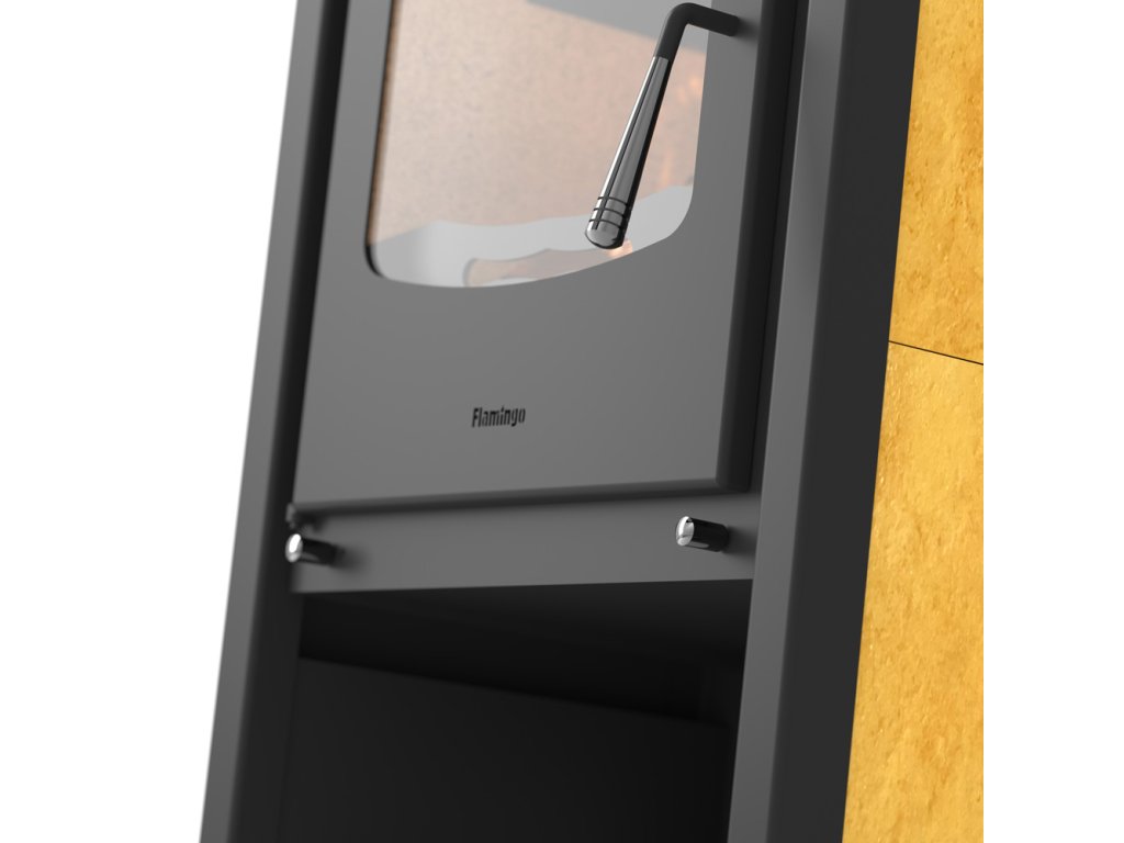 Komora je konstruovaná tak, aby byla dosažena vysoká účinnost a malá spotřeba paliva, která činí průměrně 2,5 kg na hodinu. Spalovací komora je vyrobená ze silného ocelového plechu a pro dokonalejší spalování je vysázena pravým šamotem. Sekundární spalování, krásně čisté sklo a externí přívod vzduchu je u kamen Flamingo samozřejmostí. Kamna jsou vyrobená z kvalitních materiálů a díky tomu Vám můžeme poskytnout záruku 5 let.