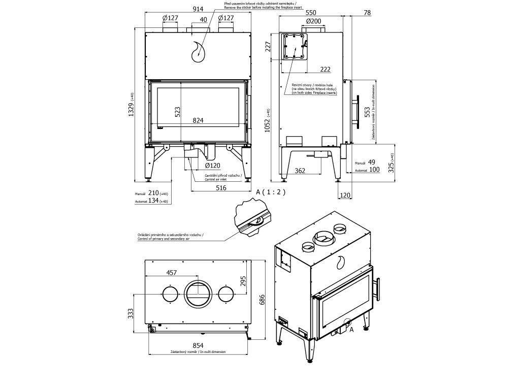 Manuální regulace - nerezové ovládání přímo na krbové vložce. Pomocí ovladače přívodu vzduchů si sami nastavíte optimální výkon. Ovladač je velice jednoduše ovladatelný a nepůsobí rušivě.