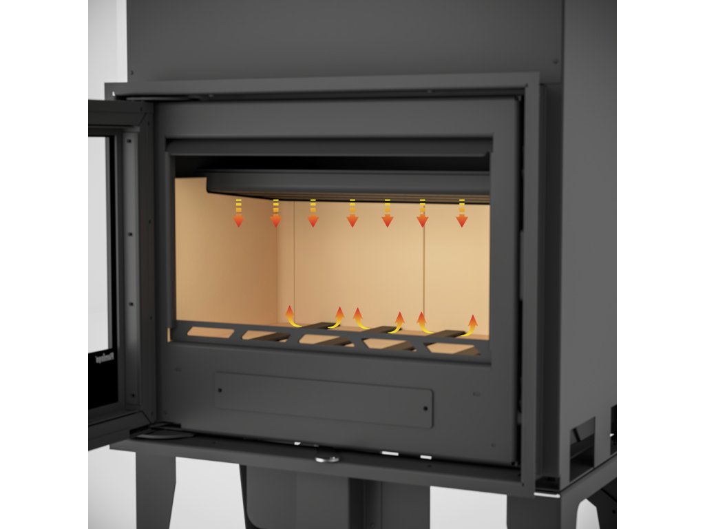 Revoluční řešení spalovací komory nabízí nepřekonatelný zážitek z ohně. Dřevo hoří po celé ploše dna, díky systému bezroštového spalování a systému kanálků na přívod vzduchu. Výsledkem je minimální spotřeba paliva. Pohled do ohně jsme povýšili na novou úroveň.