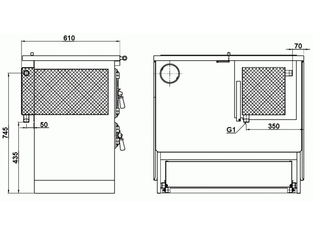 Teplovodní ohřívač ve tvaru „L“ je umístěn na zadní a boční straně topeniště (náhradou za šamotové cihly). Vývody pro připojení do topného systému ústředního vytápění jsou na zadní stěně spotřebiče. Z důvodu omezeného prostoru, v konstrukci sporáku, je teplovodní ohřívač menších rozměrů a tudíž s menším obsahem vody. Proto doporučujeme sporák zapojovat do okruhu s nuceným oběhem vody (s čerpadlem).