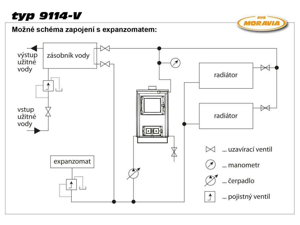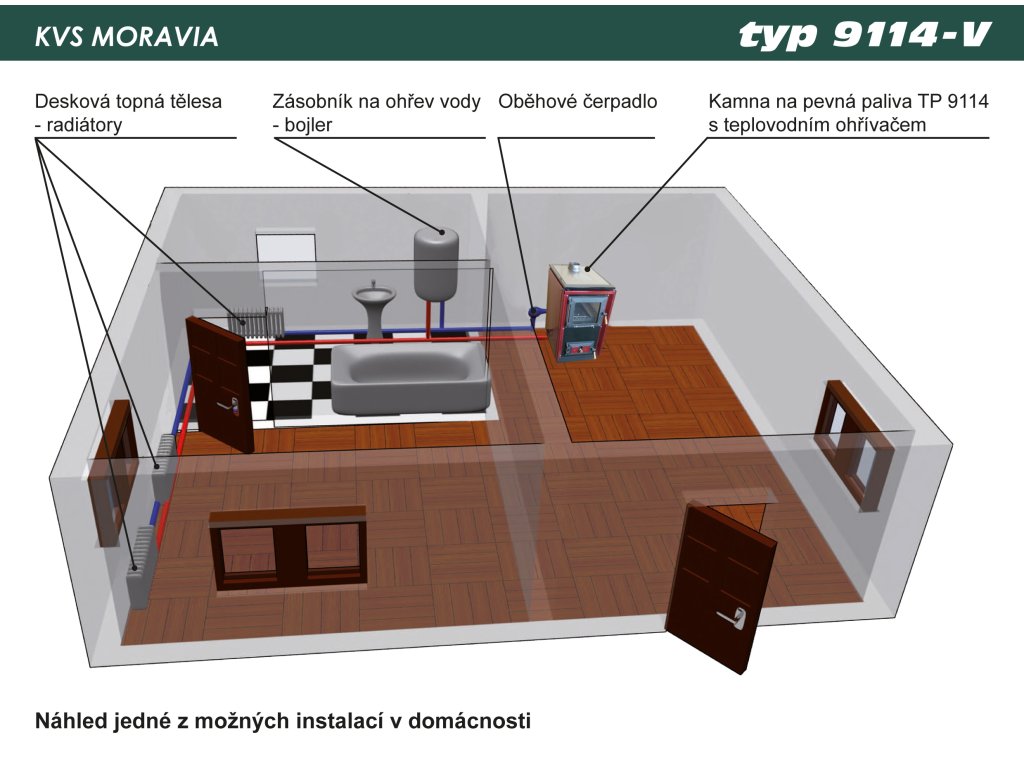 Tento typ s teplovodním ohřívačem (výměníkem) propojuje výhody spotřebiče určeného k vaření, ohřívání pokrmů, a kotle na ústřední vytápění. Typ 9114-V také okouzluje tím, že je možné vidět i plápolající oheň přes prosklená dvířka topeniště. Materiály použité při výrobě tohoto typu jsou podobné ve srovnání s ostatními typy spotřebičů KVS MORAVIA.