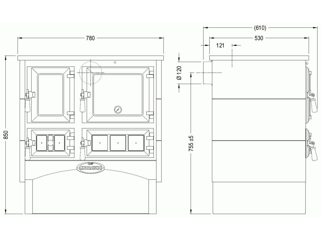 Topeniště je tvořeno jako tradičně silnými šamotovými cihlami a pevným litinovým roštem. Tyto materiály máme již léta ověřené, jsou odolné vysokým teplotám, vyznačují se pevností, stálostí tvaru a schopností déle temperovat. Do topeniště je možné vkládat polena až o průměru 160 mm a délce 340 mm. Trouba sporáku je smaltovaná a uvnitř je zabudovaný drátěný program, jehož součástí je kovová mřížka a hluboký pekáč. Teploměr na dvířkách trouby slouží k indikaci teploty v troubě. Nad dvířky trouby je umístěna páka na ovládání funkce vaření a pečení.